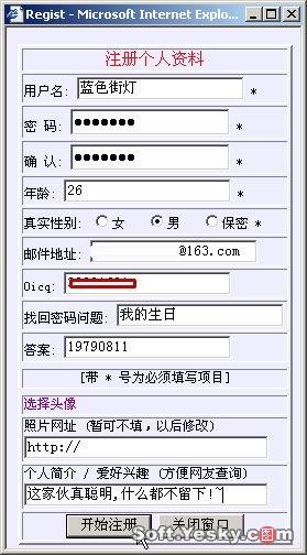 單擊首頁中的“用戶注冊”,然后在彈出的用戶注冊頁面中輸入用戶名、密碼、性別等信息(如圖24所示),單擊“開始注冊”即告完成。