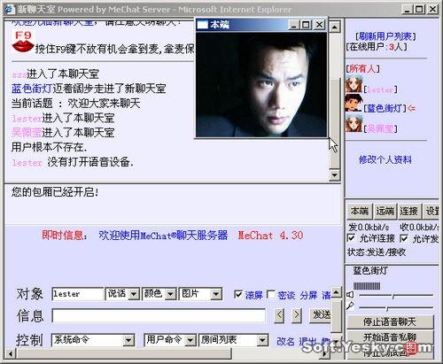 MeChat是由廣州和韻計算機有限公司開發(fā)的視頻聊天服務(wù)器。(點這里下載)與一般的采用ASP或CGI的語音聊天室不同,Mechat內(nèi)核由C 編制而成,因而速度奇快,占用服務(wù)器系統(tǒng)資源更少。另外,程序內(nèi)建WEB發(fā)布功能,無需再安裝任何WEB服務(wù)器、數(shù)據(jù)庫系統(tǒng)支持,即可,完全獨立運行(當(dāng)然,假如配合Access、MsSQLServer、MySql、Oracle等數(shù)據(jù)庫系統(tǒng),Mechat還可以得到更好的效率)。