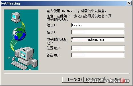 首次運行Netmeeting,軟件會出現(xiàn)一個向?qū)В髮τ脩粜畔⑦M行簡單的設(shè)定,單擊下一步,輸入個人信息,如圖4所示: