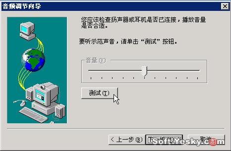 單擊“下一步”跳過Netmeeting服務(wù)器設(shè)置,此時向?qū)髮τ嬎銠C聲卡和麥克風(fēng)進行測試,如圖5。