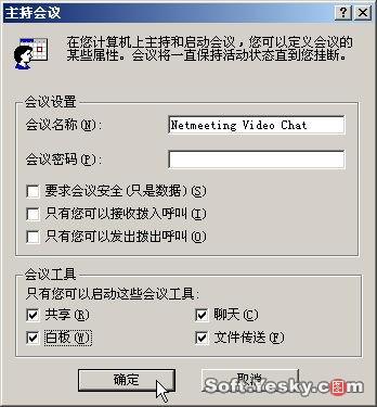 單擊“呼叫”/“主持會議”新建一個視頻會議,在彈出的會議屬性窗口中設(shè)置會議名稱(不能使用中文名)和密碼,然后,將會議工具中的“共享”、“聊天”、“白板”和“文件傳送”四個選項全選上,單擊“確定”,如圖7所示。