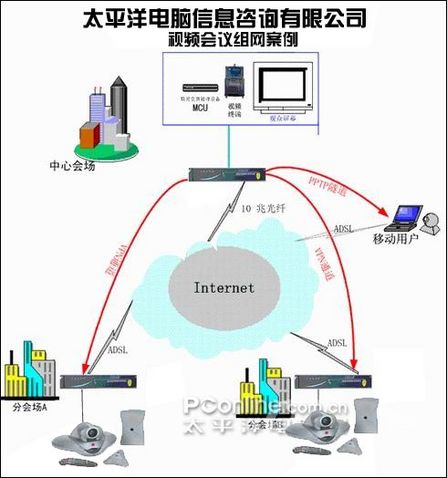 太平洋電腦網(wǎng)廣州總公司視頻會(huì)議設(shè)備連接在廣州中心的局域網(wǎng)上,其它點(diǎn)的視頻設(shè)備也連接到各自分站的局域網(wǎng)上。視頻會(huì)議的各種數(shù)據(jù)從各地視頻終端發(fā)起,通過(guò)VPN網(wǎng)來(lái)到中心會(huì)場(chǎng)視頻會(huì)議數(shù)據(jù)交換處理設(shè)備MCU,太平洋電腦網(wǎng)的MCU具有極強(qiáng)的處理能力,在處理后的數(shù)據(jù)分發(fā)給各視頻終端,這樣就實(shí)現(xiàn)了整視頻會(huì)議的聲音、圖象等的實(shí)時(shí)交互。在廣州主會(huì)場(chǎng)和各個(gè)分會(huì)場(chǎng)各放置一臺(tái)高端路由器,從而實(shí)現(xiàn)有效節(jié)約各分布的區(qū)間電話費(fèi)用支出,同時(shí)達(dá)到視頻會(huì)議的目的。