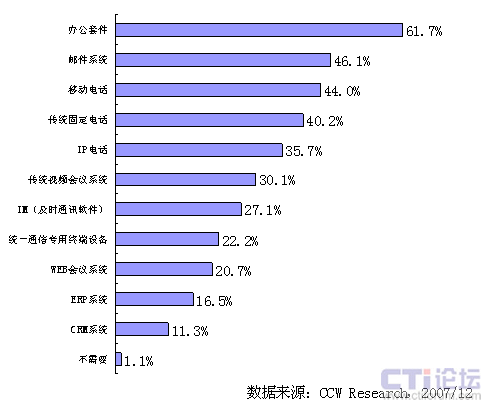 盡管統(tǒng)一通信的概念已經(jīng)被各大廠商廣為宣傳,統(tǒng)一通信的目標(biāo)是實(shí)現(xiàn)各種溝通方式的融合,但是從國內(nèi)的企業(yè)來看,他們對(duì)統(tǒng)一通信的認(rèn)識(shí)仍然還處于比較模糊的階段,那么從用戶本身來講,他們最需要統(tǒng)一通信能把哪些功能實(shí)現(xiàn)相互融合呢?2007年底,國內(nèi)ICT市場(chǎng)研究咨詢機(jī)構(gòu)計(jì)世資訊(CCW Research)對(duì)國內(nèi)的潛在用戶進(jìn)行了一次大樣本調(diào)研,被調(diào)研的企業(yè)數(shù)量超過800家,企業(yè)領(lǐng)域分布在各行各業(yè),重點(diǎn)以大中型企業(yè)為主,調(diào)研結(jié)果表明,目前國內(nèi)企業(yè)用戶希望能實(shí)現(xiàn)互聯(lián)互通功能排在第一位的是辦公套件、占到所有被調(diào)研對(duì)象的六成以上,其次是郵件系統(tǒng)和移動(dòng)電話,占近一半的比例,之后是固話、視頻會(huì)議和即時(shí)通信,而和用戶業(yè)務(wù)系統(tǒng)的整合,如ERP、CRM則排在最后。