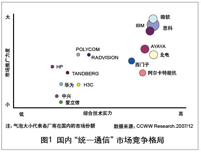 “統(tǒng)一通信”與傳統(tǒng)通信的根本區(qū)別在于不僅僅是網(wǎng)絡(luò)的融合,也是應(yīng)用的融合。從這個(gè)層面來看,“統(tǒng)一通信”真正帶給用戶的是成本的降低、工作效率的提升以及整個(gè)運(yùn)行機(jī)制的改變!敖y(tǒng)一通信”是以人性化為特征應(yīng)用層面的融合,這種融合囊括了更多的內(nèi)容、覆蓋更廣闊的領(lǐng)域、具有更大的力量,它使得通信產(chǎn)業(yè)與IT產(chǎn)業(yè),通信設(shè)備商、軟件廠商與電信運(yùn)營商之間的邊界越來越模糊,跨行業(yè)、跨領(lǐng)域的聯(lián)盟與合作成為開拓市場的必需。但隨著眾廠商的紛紛加入,多款“統(tǒng)一通信”產(chǎn)品及解決方案的推出,“統(tǒng)一通信”市場展現(xiàn)出了勃勃生機(jī)和巨大的成長潛力。在這些廠商中,有市場調(diào)研數(shù)據(jù)顯示思科市場份額領(lǐng)先,市場占有率高達(dá)35%。各類廠商之間既有競爭又有合作,但還沒有一個(gè)廠商占絕對優(yōu)勢。實(shí)際上,“統(tǒng)一通信”市場上的競爭者并不僅僅是這幾家巨頭,眾多網(wǎng)絡(luò)工具廠商、商用電話廠商也參與了這一競爭平臺(tái)。幾乎所有和ICT有關(guān)的巨頭廠商都集中在了這個(gè)領(lǐng)域,“統(tǒng)一通信”正進(jìn)入群雄爭霸的時(shí)代。國內(nèi)“統(tǒng)一通信”市場競爭格局如圖1所示。