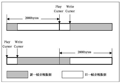 從理論上講,這已經(jīng)保證了音頻回放的流暢性。但在實現(xiàn)過程中,由于操作的對象是一幀的音頻數(shù)據(jù),其回放的時間僅是0.25秒,所以必須考慮的一個問題是程序的反應速度問題。如果忽略由事件觸發(fā)到真正用Lock函數(shù)鎖定緩沖區(qū)的部分以進行新數(shù)據(jù)寫入之間的時間,則這種實現(xiàn)方法沒有任何問題。除了最開始的兩幀數(shù)據(jù)外,新的一幀數(shù)據(jù)會緊跟在前一幀數(shù)據(jù)之后,彼此之間沒有重疊部分,也沒有空隙存在,能很好地達到音頻回放的流暢效果。但事實上,由事件觸發(fā)到真正用Lock函數(shù)鎖定緩沖區(qū)的部分以進行新數(shù)據(jù)的寫入之間還必須經(jīng)過線程監(jiān)聽到事件,分析事件對應的緩沖區(qū),然后再觸發(fā)相應的回調(diào)函數(shù)來進行