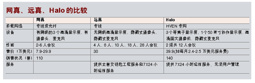 惠普的Halo工作室系統(tǒng)強(qiáng)調(diào)可用于企業(yè)遠(yuǎn)程模擬面對(duì)面業(yè)務(wù)會(huì)議。通過(guò)Halo連接,每個(gè)Halo工作室可支持會(huì)議桌前排六人,第二排三至六人,最多12人的會(huì)議規(guī)模。每個(gè)工作室有三臺(tái)等離子顯示器,參會(huì)人員能夠看到與本人同樣大小的圖像。另外,參會(huì)者還可使用一個(gè)安裝在等離子顯示器上方的50英寸的協(xié)作屏幕,與其他Halo工作室中的人員共享其筆記本電腦中的文件與數(shù)據(jù)。工作室還包括一個(gè)高清圖文攝像機(jī),可用于拍攝桌上的物品并顯示在協(xié)作顯示器上,真實(shí)呈現(xiàn)色彩、陰影與細(xì)微之處。同時(shí)配備的電話(huà)讓與會(huì)者可以與Halo工作室外的人員聯(lián)系。工作室配備了廣播質(zhì)量的音頻與照明設(shè)施,參會(huì)者可以使用屏幕上簡(jiǎn)便的用戶(hù)界面,通過(guò)點(diǎn)擊鼠標(biāo)開(kāi)始協(xié)作。一個(gè)復(fù)雜的軟件控制系統(tǒng)將確保各個(gè)Halo工作室輕松、無(wú)縫地協(xié)同工作。