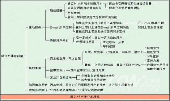 在給某移動(dòng)運(yùn)營(yíng)商進(jìn)行的接通率優(yōu)化咨詢項(xiàng)目中,利用呼叫中心接通率優(yōu)化模型進(jìn)行了分析,圖2是針對(duì)分流呼叫中心總體呼叫量所提出的建議措施。