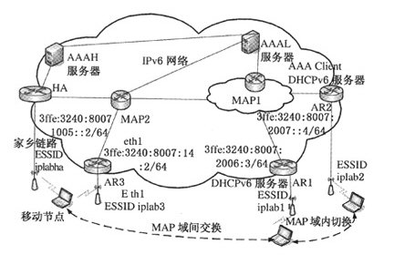 分別在MN上啟動HMIPv6程序,在HA上啟動HMIPv6程序和DHCPv6服務(wù)器程序,在AR1、AR2和AR3上啟動DHCPv6服務(wù)器端程序和路由通告協(xié)議。在服務(wù)器上啟動AAA服務(wù)器端程序。通過手動修改ESSID在家鄉(xiāng)與不同的MAP域之間進(jìn)行切換,完成在切換過程的接入認(rèn)證過程。