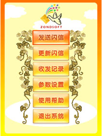 “閃信”的主操作界面設(shè)計簡潔、顏色以明快的橙色位置。功能選項整齊的排列在屏幕中央。功能項共分為6大項“發(fā)送閃信、收發(fā)記錄、更新閃信、參數(shù)設(shè)置、使用幫助、退出系統(tǒng)”功能項的設(shè)置簡潔,功能名稱使人看過之后就可以迅速理解了各個選項的功能重點。