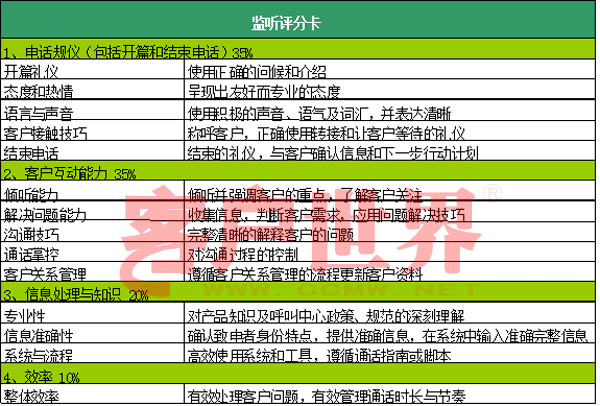 b.一個不可忽視的工作是對表中的各項進行嚴格定義,然后訓導師與主管、培訓、質檢師根據共同的錄音資料反復“核對筆記”,取得共識,并將樣本打分結果發(fā)給座席代表溫習。
