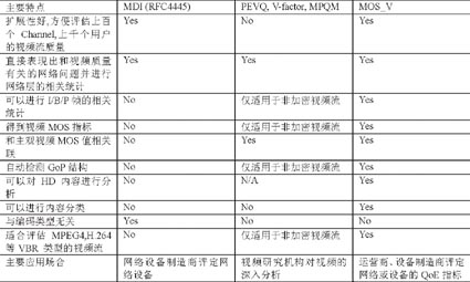 視頻流質(zhì)量是指視頻流在網(wǎng)絡(luò)中傳輸由于網(wǎng)絡(luò)的各種損傷對(duì)視頻流造成的影響,評(píng)定視頻流的質(zhì)量一般有兩種方法和指標(biāo):一種從網(wǎng)絡(luò)層進(jìn)行評(píng)定的MDI以及采用各種客觀指標(biāo)對(duì)視頻質(zhì)量主觀評(píng)定的MOS_V,另一種是視頻的全參考(Full Reference)質(zhì)量評(píng)定。幾種評(píng)定方面的簡單比較如表1所示,相應(yīng)指標(biāo)的介紹可以參考《電信網(wǎng)技術(shù)》2007年第12期的《IPTV QoE測試指標(biāo)概述》。