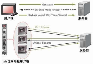 IXIA視頻測試方案可以很好地對(duì)VOD視頻服務(wù)器進(jìn)行支持,由于目前各個(gè)廠家對(duì)VOD業(yè)務(wù)所采用的RTSP控制協(xié)議進(jìn)行了不同程度和不同方式的修改和定制,要和VOD服務(wù)器進(jìn)行互通有一定的難度,IXIA根據(jù)這一特定的測試要求,可以對(duì)RTSP的流程進(jìn)行靈活定制和調(diào)整,支持RTSP各個(gè)命令信息交互的定制,支持的命令包括Describe,Setup,Play,Pause,Get Parameter,Set Parameter,Teardown等,這些靈活的特性可以保證IXIA能夠和業(yè)界幾乎所有的VOD服務(wù)器進(jìn)行互通并進(jìn)行性能測試。這是IXIA在視頻服務(wù)器測試方面非常重要的特性。目前,IXIA是Seachange公司視頻服務(wù)器認(rèn)證的測試工具(http://www.catr.cn/ctu/cshdt/200710/t20071031_646571.htm)。可以和Thompson,Bitband,Harmonic,Darwin以及Windows Media Server等業(yè)界常見的視頻服務(wù)器互通并提供性能測試。圖3是VOD服務(wù)器交換過程與IXIA進(jìn)行性能測試示意。