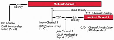 。6)頻道重疊時(shí)間:如果系統(tǒng)頻道切換采取接收到所請(qǐng)求頻道的組播包之后才停止原頻道的組播包的方式,則頻道重疊時(shí)間即指接收到所請(qǐng)求頻道的第一個(gè)組播包與接收到原頻道的最后一個(gè)組播包之間的時(shí)間間隔。
