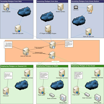 大多數(shù)情況下,手機(jī)和廣播系統(tǒng)互動的目的都是為了獲取某些UGC并將之發(fā)布到廣播系統(tǒng),以覆蓋模式(例如屏幕底部的帶狀區(qū))顯示在電視或者活動現(xiàn)場的大屏幕里。這類UGC是推動用戶互動的一個絕佳方法。它拉近了組織者和觀眾的距離,為觀眾或者活動參與者提供了有趣的體驗。
