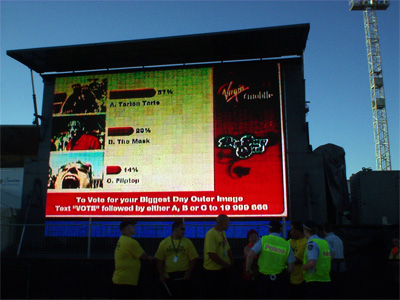 比如,某些公司可能會使用上面所述的調(diào)節(jié)型文本信息收發(fā)方式來顯示滾動的帶狀區(qū)內(nèi)容,但也會在文本顯示的過程中覆蓋某張由手機(jī)用戶拍攝的圖象。這張圖片一般可能是該用戶的貓或狗,然后加上一些有趣的元素。在戶外活動中,我們可以用拍到的圖象來加強文本信息。比如,活動現(xiàn)場可以就屏幕上的一張照片提問“他夠不夠火辣?”。這樣的問答結(jié)果隨后就可以被實時廣播到屏幕上。