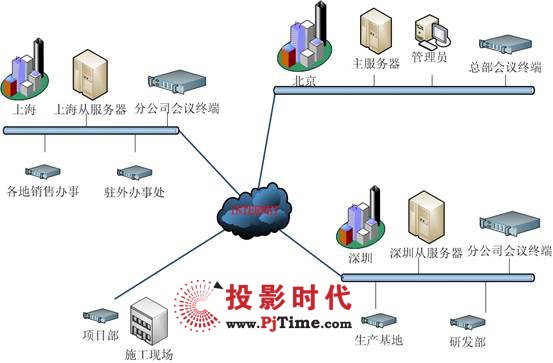 3臺(tái)高端專(zhuān)用服務(wù)器作為視頻會(huì)議服務(wù)器,可容納多點(diǎn)同時(shí)開(kāi)會(huì),以確保系統(tǒng)的穩(wěn)定性和性能要求。主服務(wù)器放置在總公司,從服務(wù)器共2個(gè),分別放置在輻射分公司面大,位于分公司中心的兩個(gè)城市。所有接入的服務(wù)器和客戶端采用同一網(wǎng)絡(luò)服務(wù)商的線路。配置了使用1000M服務(wù)器專(zhuān)用網(wǎng)卡,以保證正常的音視頻信號(hào)的傳輸。并且將服務(wù)器放置在主干/核心交換機(jī)上,使服務(wù)器和客戶端的路由/交換性能達(dá)到最佳效果。其網(wǎng)絡(luò)拓?fù)鋱D如下: