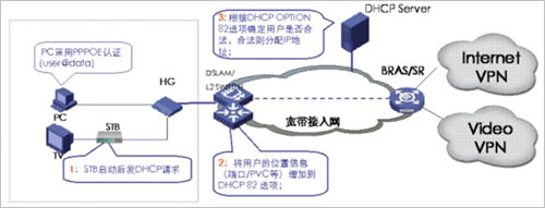 當(dāng)網(wǎng)絡(luò)設(shè)備收到STB的DHCP請求報文時,需要在報文后添加OPTION82字段,此時有兩種模式進(jìn)行DHCP+認(rèn)證,一種是直接把DHCP報文送給DHCP服務(wù)器,由DHCP服務(wù)器根據(jù)OPT82字段來判斷該用戶是否為合法用戶,從而決定是否為其分配IP地址。另一種是DHCP報文先送到BRAS,由BRAS將OPT82字段放到RADIUS的一個子域里,通過RADIUS服務(wù)器來進(jìn)行用戶合法性認(rèn)證,若用戶合法,再由DHCP服務(wù)器分配IP地址。