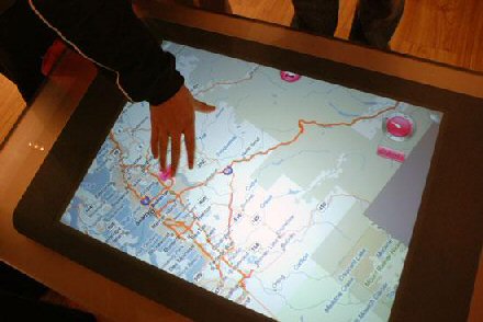 本次展會,微軟除了展示W(wǎng)indows Live應(yīng)用,以及Windows Mobile手機操作系統(tǒng)以外,還重點展示了Surface全觸摸概念電腦。其具有一個嵌在桌面內(nèi)的30英寸水平顯示器,用戶可以直接用手在上面點餐、玩游戲、畫畫、點歌、查詢地圖等等。