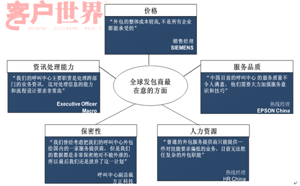 經過研究,我們發(fā)現(xiàn)全球發(fā)包商最在意五個方面:價格、服務品質、人力資源、保密性和咨詢處理能力。