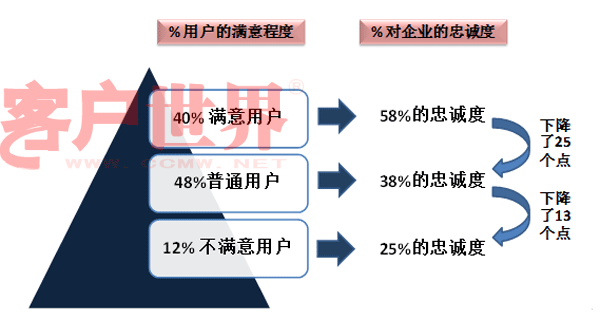 我們從圖中可以看到相比較滿意用戶,普通用戶對企業(yè)的忠誠度就會下降25個點,而不滿意用戶忠誠度更是只剩下25個點。