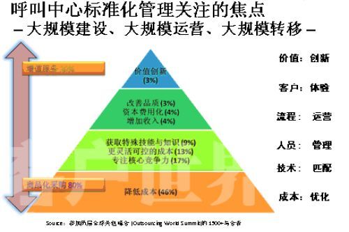 那么,對于這個尚處在”嬰兒潮”時期的產(chǎn)業(yè),我們最應該做些什么來呵護和培育這個產(chǎn)業(yè)健康有序的發(fā)展?大家要好好呵護這個行業(yè)。如果只是強調(diào)“要想讓呼叫中心發(fā)展,那就需要我們多投錢,這樣就能買許多機器,放在公司里面。規(guī)格有了,那呼叫中心就發(fā)展了。”我覺得這樣的說法是對呼叫中心發(fā)展的錯誤理解。我們這個標準是希望營建專業(yè)化的產(chǎn)業(yè),整個呼叫中心產(chǎn)業(yè)的價值金字塔,這個金字塔每年在美國有一個專場,就叫呼叫中心專場,標志一個產(chǎn)業(yè)成熟的金字塔是怎樣的。通過調(diào)查發(fā)現(xiàn),當產(chǎn)業(yè)進入成熟階段,標準化服務的第一個就是降低成本,也就是提高生產(chǎn)效益,能夠把這個產(chǎn)業(yè)細化分解,高度的模塊化進行精細控制的時候,其他的差異化的體現(xiàn)。呼叫中心本身是不是成為企業(yè)核心競爭力的一部分,或者說越來越成熟的外包商出現(xiàn),能夠把一些企業(yè)非核心競爭力加入到自己的核心競爭力之上,這叫專業(yè)化。還有一個更加靈活可控的成本,呼叫中心的彈性從一百人到一千人,一千人到三千人的發(fā)展更加可控。還有獲得特殊技能與知識,事實上呼叫中心各行各業(yè)知識都會接觸,你只有專著才能做得更好,本身對于呼叫中心的從業(yè)人員來說,在這個產(chǎn)業(yè)中扮演的角色不是締造一個企業(yè)的核心競爭力,怎么期望從業(yè)人員掌握更多的技能和知識,來指導更多的行業(yè)和企業(yè)。特別是在客戶導向上面的發(fā)展,還有在金字塔上面增加收入,分析客戶所需,讓我們更好的滿足客戶的需求;然后資本費用化,從外包專業(yè)化領域帶來的變化,很多的時候最大的一筆建設是呼叫中心,基本一個中等的呼叫中心沒有500萬以上的資金投入是不可想象的。