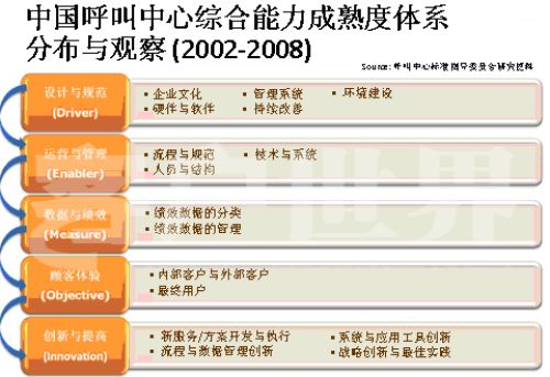 在過去幾年我們也做了很多研究,一個呼叫中心整合持續(xù)建設在哪些方面應該做定義。基本上我們是分為五個方面,在每一級的成熟度方面,我們的呼叫中心都關注自己的成熟度。1、設計與規(guī)范;2、運營管理;3、數(shù)據(jù)與績效;4、顧客體驗;5、創(chuàng)新與提高。第五方面創(chuàng)新與提高在CMM模型中是特有的,它在整個產(chǎn)業(yè)的發(fā)展過程中,提供戰(zhàn)略革新和戰(zhàn)略工具一體化使用的指導框架和最佳實踐。