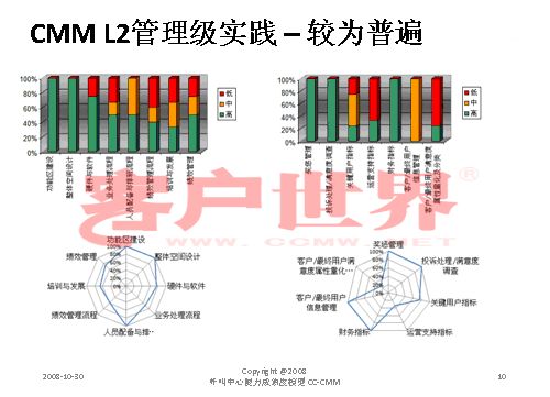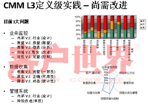 接下來我用一個很小的案例結束今天的分享,我們整個的呼叫中心的成熟度模型目前是在電信行業(yè)開始了2008年版的推廣,成熟度模型經(jīng)歷從07年成立亞太呼叫中心產(chǎn)業(yè)聯(lián)盟以后,由一群這個行業(yè)里面的專家,特別是中國產(chǎn)業(yè)市場的發(fā)展建立起的標準,一年以來在通信行業(yè)我們做的能力成熟度的判定有一些很有意思的啟示,通信行業(yè)占到我們整個呼叫中心產(chǎn)業(yè)約70%的坐席,是最大的、最有代表性的產(chǎn)業(yè)。做下來真的很有代表性,普遍性在于環(huán)境建設、資產(chǎn)投入、資產(chǎn)配置,所以這下面的雷達就可以看到,相對完善都是在環(huán)境建設,功能區(qū)建設,整體空間設計、硬件相對來說比較偏硬的一些。在其他方面偏廢的比較厲害。第二個雷達在一些獎懲管理、信息管理,整個軟性方面幾乎有很濃重的一些計劃經(jīng)濟,制造行業(yè)的一些領域相對來說比較成熟。我們目前看到的,基本上通信行業(yè)的一些發(fā)展在能力成熟度上是二級到四級,尤其以二到三級的發(fā)展更為普遍。通常的方法為期一周的標桿調(diào)研,看所有的呼叫中心發(fā)展的五個方面,我們才會在里面做這樣的判定。在能力成熟度的三級,我們做了一些企業(yè)發(fā)現(xiàn),特別在三級,關于能不能對流程進行一致性管理方面,就是剛才李老師講到的不是最急的,而管理是最重要的。可能所有的流程多多少少有一些成熟度的問題,但是我們的源頭流程能力在三個方面有很大的差距:一個是業(yè)務監(jiān)控流程,第二個數(shù)據(jù)收集流程,還有一個是管理系統(tǒng)的審核流程。這個大家可以和自己的呼叫中心比一比。