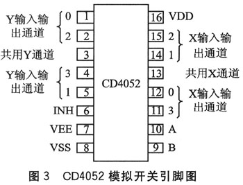 51系列單片機(jī)一般只有一個(gè)串行通路,通過(guò)串口與GSM模塊連接后,則不能再連接其他串口設(shè)備;而一些串口擴(kuò)展芯片成本較高,連接也較麻煩。本方法利用數(shù)控模擬開關(guān)CD4052來(lái)做多串口擴(kuò)展器,成本低廉而且接線簡(jiǎn)單。其引腳排列如圖3所示。