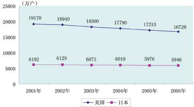 關(guān)于固定電話(huà)受沖擊的現(xiàn)象,美國(guó)比日本更加突出,這是因?yàn)槊绹?guó)大的通信公司除了提供電話(huà)、電視和高速上網(wǎng)捆綁服務(wù)外,基本上不提供IP電話(huà)(普通電話(huà)機(jī)經(jīng)本地市話(huà)交換機(jī)以及網(wǎng)關(guān)進(jìn)入因特網(wǎng))和VoIP電話(huà)(普通電話(huà)機(jī)經(jīng)電話(huà)連接器進(jìn)入因特網(wǎng))。美國(guó)衛(wèi)生統(tǒng)計(jì)中心公布的數(shù)據(jù)顯示,2007年下半年,美國(guó)只有移動(dòng)電話(huà)而沒(méi)有固定電話(huà)的家庭比例達(dá)到15.8%,這一比例在2004年同期只有6.1%,大約2%的美國(guó)家庭沒(méi)有電話(huà)。