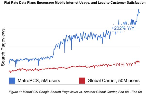 這里以美國一家地區(qū)性的小運營商MetroPCS為例,MetroPCS的CDMA用戶數(shù)剛超過500萬。在過去的一年里,MetroPCS的Google搜索量增長了2.5倍。而這個數(shù)字,是那些全球性的、擁有大量用戶和3G網(wǎng)絡運營商的10倍。