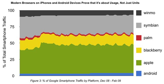 這里有個例子:iPhone、Android手機雖然僅占到智能手機市場份額的13%,卻貢獻了50%的智能手機Google搜索流量(Google訪問)。