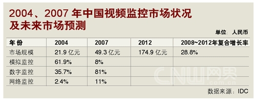 IDC的數(shù)字同樣樂觀。跟據(jù)IDC在2008年的預測,2008~2012年,中國視頻監(jiān)控市場的年均復合增長率將達28.8%,遠高于IT市場投入的平均增長率。而在模擬、數(shù)字與IP模式(即網(wǎng)絡監(jiān)控)組成的視頻監(jiān)控市場里,IP的增長率又將高于前二者,成為市場增長的強勁動力!保ㄗⅲ耗M監(jiān)控是指圖像信號在采集后,通過模擬信號傳輸?shù)姆忾]式視頻監(jiān)控系統(tǒng)模式;數(shù)字監(jiān)控是指圖像信號在采集后,經(jīng)過編碼轉(zhuǎn)化成數(shù)字信號再進行傳輸?shù)姆忾]或半封閉式視頻監(jiān)控系統(tǒng)模式;網(wǎng)絡監(jiān)控是指系統(tǒng)建立在以網(wǎng)絡為基礎的傳輸平臺的開放式視頻監(jiān)控系統(tǒng)模式)。