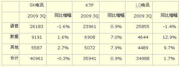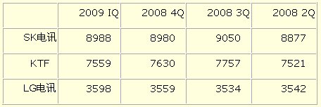韓國三大移動通信公司ARPU(平均每用戶值)比較