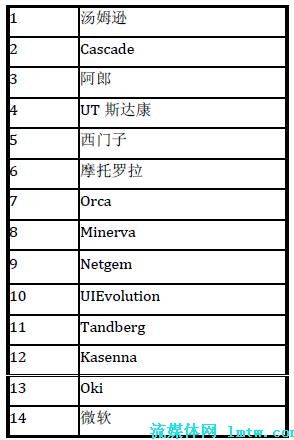 在中國(guó)市場(chǎng)上,UT 斯達(dá)康和中興公司暫時(shí)領(lǐng)先于其他公司。其中,UT 斯達(dá)康在海外也有不俗的表現(xiàn),如在印度和日本市場(chǎng)等;華為公司可以借助其整體解決方案的實(shí)力,有機(jī)會(huì)在下一代基于IMS 的IPTV 解決方案中脫穎而出。MRG 曾經(jīng)在2007 年3 月公布過(guò)一個(gè)市場(chǎng)調(diào)查,對(duì)IPTV 中間件及其市場(chǎng)影響力進(jìn)行了一個(gè)排名,具體的結(jié)果見(jiàn)表1。