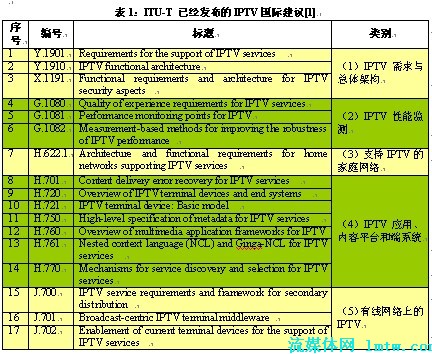 ITU-T已經(jīng)推出的IPTV國際標(biāo)準(zhǔn)涉及需求和架構(gòu)、性能監(jiān)測、家庭網(wǎng)絡(luò)、應(yīng)用平臺與端系統(tǒng)以及有線網(wǎng)上的IPTV等5大領(lǐng)域,是全球范圍內(nèi)IPTV產(chǎn)業(yè)界達(dá)成的共識,具有廣泛的產(chǎn)業(yè)基礎(chǔ)。