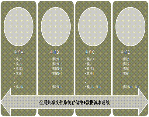 該技術方案是依靠在存儲管理虛擬層上構建并行文件系統(tǒng),實現(xiàn)所有業(yè)務主機共享同一份數(shù)據(jù)視圖,實現(xiàn)并發(fā)數(shù)據(jù)共享訪問的架構設計方案。其架構示意圖如下: