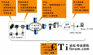 此外,為了提高對IPTV節(jié)目流點播的響應(yīng)和傳輸實時性,以及解決或減緩IPTV點播請求之沖擊性和波動性對IPTV前端設(shè)計容量所造成的壓力,IP骨干網(wǎng)和IP城域網(wǎng)上普遍采用了內(nèi)容分送網(wǎng)絡(luò)技術(shù)。IP骨干網(wǎng)和IP城域網(wǎng)也可以采用不同的低層物理網(wǎng),以IP over SDH/SONET(即Packet over SDH/SONET),IP over ATM或IP over DWDM Optical(如千兆/萬兆光以太網(wǎng))的方式提供傳輸服務(wù)。有線電視前端或電信中心站則根據(jù)相應(yīng)的寬帶接入網(wǎng)絡(luò),如Cable Modem網(wǎng)絡(luò)或DSL網(wǎng)絡(luò)將IP視音頻流媒體節(jié)目流以IP over DOCSIS或IP over DSL的方式,通過放在有線電視前端的CMTS鑒定或電信中心站的DSLAM設(shè)備,向用戶發(fā)送出去。有線電視前端或電信中心站還往往配備有視音頻流媒體節(jié)目流內(nèi)容服務(wù)器和DRM授權(quán)/密鑰服務(wù)器,具有節(jié)目存儲和服務(wù)功能。   IPTV用戶終端設(shè)備被用來接收、存儲和播放及轉(zhuǎn)發(fā)IP視音頻流媒體節(jié)目;拘虸PTV用戶終端設(shè)備的硬件沒有內(nèi)置CableModem或DSLModem,它只提供一個以太網(wǎng)接口,與外部的CableModem,DSL Modem或以太網(wǎng)HUB相接。集成式的IPTV用戶終端設(shè)備則內(nèi)置Cable Modem或DSL Modem,可與Cable Modem或DSL寬帶網(wǎng)絡(luò)直接相連。高端IPTV用戶終端設(shè)備還帶有內(nèi)置硬盤,可以提供IPTV DVR功能,甚至支持IEEE802.11無線聯(lián)網(wǎng)功能,能將受DRM保護(hù)的IP視音頻流媒體節(jié)目通過無線傳輸給其他設(shè)備,如PC機(jī)等。一個IPTV用戶終端設(shè)備必須帶有IPTV系統(tǒng)所使用的DRM技術(shù)之客戶端軟件。為了使IPTV系統(tǒng)成為一個開放式的業(yè)務(wù)平臺,IPTV用戶終端設(shè)備通常還使用了中間件軟件。EPG、用戶管理、媒體資產(chǎn)管理、收費(fèi)及各種應(yīng)用業(yè)務(wù)的相關(guān)軟件也是IPTV系統(tǒng)之必須具有的部件。