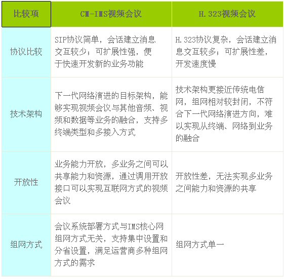 表1 CM-IMS視頻會(huì)議和傳統(tǒng)的H.323視頻會(huì)議比較