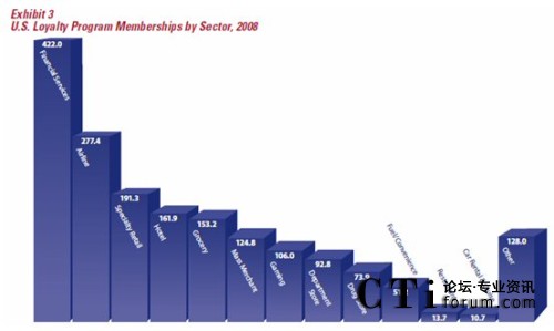 在美國(guó),忠誠(chéng)度營(yíng)銷應(yīng)該用為廣泛的五個(gè)行業(yè)/領(lǐng)域是金融服務(wù)(銀行、保險(xiǎn)、證券、基金等)、航空、專門零售(例如各類的專賣店、品牌連鎖)、酒店及百貨。值得一提的是,近兩年來,金融服務(wù)行業(yè)在忠誠(chéng)度營(yíng)銷的應(yīng)用發(fā)展迅速,各類忠誠(chéng)度計(jì)劃的參與人數(shù)由2006年的2.388億上升到2008年的4.22億,這個(gè)增長(zhǎng)主要是由各類具備信用卡、借記卡功能的聯(lián)名卡發(fā)行所致。
