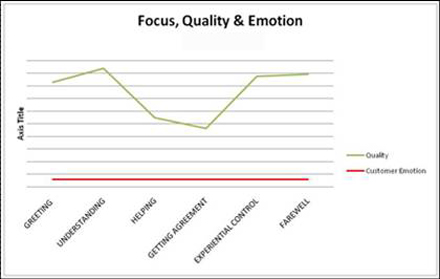 第二張圖片中客戶在很生氣的狀態(tài)下開(kāi)始呼叫,而代理除了幫助階段外表現(xiàn)得都很好。該代理執(zhí)行的是最低績(jī)效標(biāo)準(zhǔn),但他對(duì)客戶的影響卻等于零。分析師提出了一個(gè)非常明顯而重要的關(guān)節(jié)——幫助是整個(gè)呼叫中最為重要的環(huán)節(jié)。這就是我們要做的事情。如果在幫助這一環(huán)上沒(méi)做好,那么其它環(huán)節(jié)如感謝客戶、問(wèn)候客戶等等都變得無(wú)足輕重。
