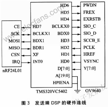 該芯片使用OmniVision公司自主開發(fā)的SCCB總線進行控制,使用三線連接。其中SCCB_E為串口允許/禁止信號線,SIO_C和SIO_D分別為串口時鐘線和數(shù)據(jù)線。系統(tǒng)中僅對OV9640進行控制而不需要獲知其狀態(tài),采用DSP的McBSPO端口進行連接,其中HD3用于打開串口,BCLKX0和HDX0分別用于發(fā)送時鐘信號和控制數(shù)據(jù)。具體的硬件連線如圖3所示。