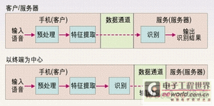 3G手機(jī)的ASR應(yīng)用設(shè)計(jì)可分為兩類,即以終端為中心和以客戶/服務(wù)器為中心的應(yīng)用。如圖1所示為以終端為中心的設(shè)計(jì)方法,3G手機(jī)(終端)執(zhí)行整個(gè)語音識(shí)別過程并送出識(shí)別結(jié)果。在圖2所示的客戶/服務(wù)器方法中,終端只是執(zhí)行預(yù)處理特征提取,然后通過一個(gè)誤碼受保護(hù)的數(shù)據(jù)信道將這些參數(shù)發(fā)送給中心服務(wù)器,中心服務(wù)器最終完成語音識(shí)別。如果采用以客戶/服務(wù)器為中心的設(shè)計(jì)方法,3G手機(jī)應(yīng)使用數(shù)據(jù)信道而非移動(dòng)信道來將語音發(fā)送給服務(wù)器進(jìn)行識(shí)別,因?yàn)橐苿?dòng)信道所用的低速率語音編碼會(huì)嚴(yán)重影響語音識(shí)別的性能。