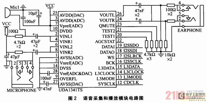 語音采集和播放模塊的作用是將音頻模擬信號轉換為數字信號,并對信號進行PCM編碼。其電路如圖2所示。采用Philips公司的UDA1341 TS型立體聲音頻CODEC進行音頻編解碼。該芯片提供2個麥克風輸入,可實現單端輸入、差分輸入等靈活配置,并設置了可編程增益放大器和自動增益控制器,可保證高質量的音頻獲;同時,還集成了聽筒和喇叭輸出的驅動器,喇叭音量可以通過編程調整。S3C2440A-40微處理器與UDA1341TS編解碼器通過I2S總線直接相連,并采用DMA發(fā)送/接收方式,完成系統的錄音和放音。