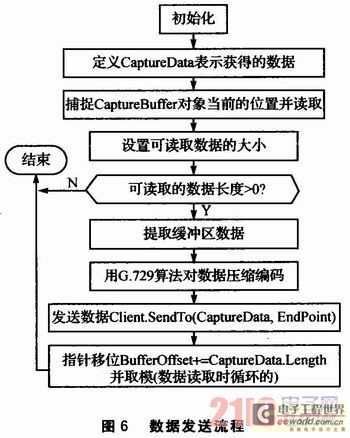 數據發(fā)送函數的作用是將語音捕捉緩沖區(qū)的數據通過Client.SendTo(CaptureData,EndPoint)函數發(fā)送到網絡上。當線程發(fā)現有數據要讀取(即線程被觸發(fā))時,就會循環(huán)調用數據發(fā)送函數,直到沒有可讀的數據為止。CaptureBuffer為語音捕捉緩沖區(qū)對象。數據發(fā)送流程如圖6所示。