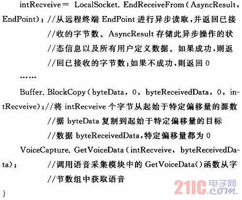 數據接收函數的功能主要是調用GetVoiceData()函數從網絡中接收語音數據并放入緩沖區(qū)。代碼如下: