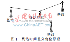 TDOA作為主要的定位技術(shù)在第三代移動通信網(wǎng)絡(luò)中得到了廣泛的應(yīng)用。在3GPP的WCDMA中,基于TDOA定位技術(shù),即觀測到達(dá)時間差分OTDOA(Observed Time Difference of Arrival);在3GPP2的CDMA2000中,稱為高級前向鏈路三角測量法A-FLT(Advanced Forward Link Trilateration)。這些方法的原理相同,都是通過信號到達(dá)時間差值,確定不少于兩條雙曲線,再通過這些雙曲線的交點,確定移動臺的位置。到達(dá)時間差分定位原理如圖1所示。