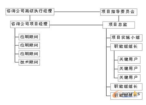 階段2:項(xiàng)目啟動 這支隊(duì)伍既有企業(yè)高級管理層所組成的指導(dǎo)委員會和咨詢公司人員,也有來自信息部門的技術(shù)人員和相應(yīng)職能部門的熟悉企業(yè)流程的業(yè)務(wù)人員所組成的實(shí)施小組和職能小組。項(xiàng)目隊(duì)伍組織結(jié)構(gòu)如圖所示