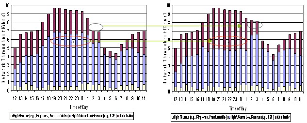 合理調(diào)配資源是指應(yīng)用智能管道技術(shù),并結(jié)合激勵型市場定價,運營商能夠減少網(wǎng)絡(luò)空載時間或降低低載率,在網(wǎng)絡(luò)忙時留出更多的資源給高付費用戶和業(yè)務(wù),從而在相同的資源下獲得更高的收益。下圖是某運營商引入智能管道前后的數(shù)據(jù)分布效果圖,忙時高付費業(yè)務(wù)增加,非忙時總業(yè)務(wù)量增加(主要來自于低付費業(yè)務(wù)),這些都為運營商帶來了額外的收入。實際增收效果會因智能管道策略的力度和動態(tài)調(diào)整的效果而有不同,通常都會增加幾個百分點甚至更高。