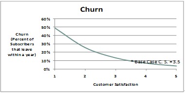 部署智能管道可以在網(wǎng)絡(luò)容量和業(yè)務(wù)保障方面產(chǎn)生積極影響。針對高端用戶提供免溢價的高價值服務(wù)/業(yè)務(wù),會提高高端用戶群體的滿意度。高端用戶是高額利潤的保障,是所有運營商爭取的目標(biāo),而用戶滿意度是決定他們是否留在網(wǎng)絡(luò)的最重要因素。應(yīng)用智能管道后,預(yù)期年離網(wǎng)率將下降1%~2%。離網(wǎng)率的降低,將使用戶平均停留在本網(wǎng)絡(luò)的周期加長,從而增加收入并減少新用戶的獲取成本。這一部分的價值和意義,將大于資源合理分配和差異化業(yè)務(wù)的價值。下面的圖表顯示了離網(wǎng)率和用戶滿意度的關(guān)系。