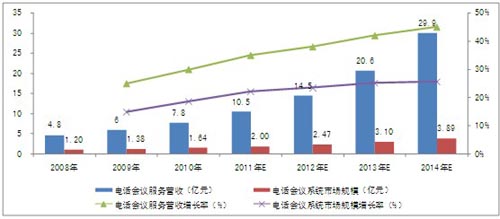 圖表 4 2008-2014年中國電話會議市場規(guī)模及增長率